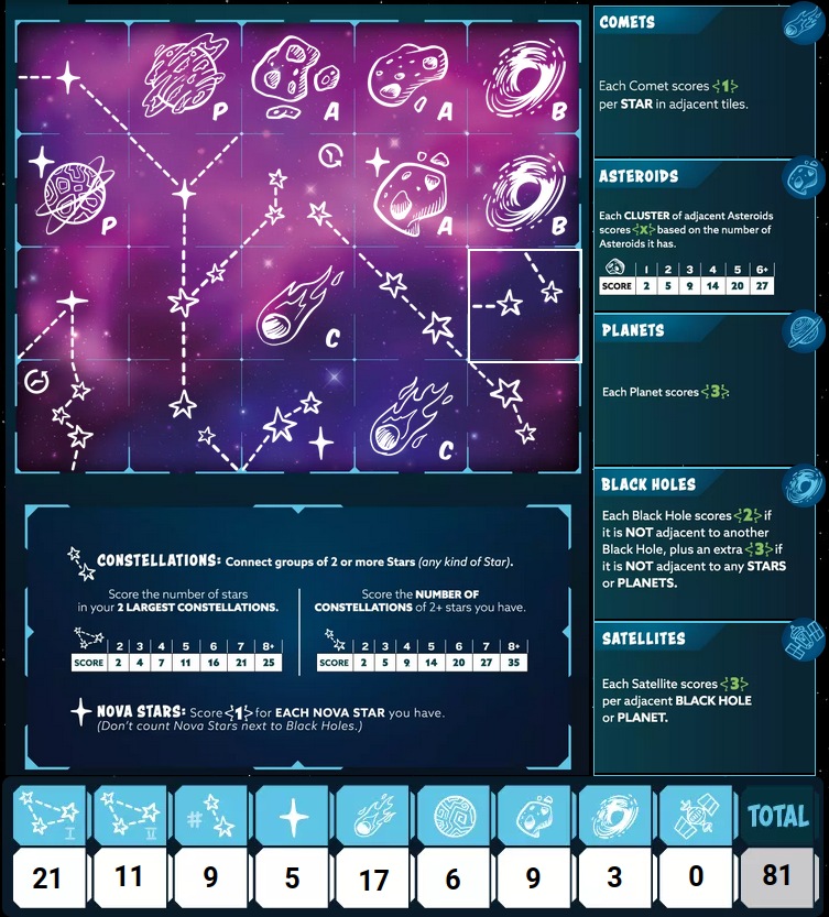Und das war es auch schon, was „Twinkle Twinkle“ an Interaktion bietet. Bis auf die Wahl der Plättchen und die Spielerreihenfolge füllt jeder für sich sein Tableau und zählt am Partieende Punkte zusammen. Es gibt zwar manche Wertungen, die Minuspunkte geben, wenn man zum Beispiel die wenigsten Asteroiden hat, aber das macht sehr wenig aus. Das Spiel ist also mehr für Tüftler gedacht, die gerne für sich etwas aufbauen, ohne dass jemand anderes das kaputtmachen kann.