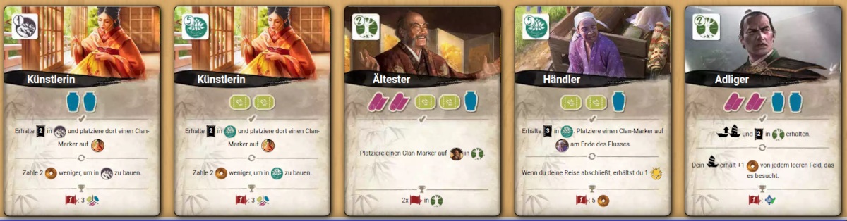 Was mir sehr gut gefallen hat, sind die Zielvorgaben. Auf die Art hatte ich von Spielstart an etwas im Blick, was ich erreichen wollte. Dass diese Ziele gar nicht so viele Punkte abwerfen (im Vergleich zur Gesamtpunktzahl), ist dabei zweitrangig. Auf dem Weg zu diesen Zielen ergeben sich dann andere Möglichkeiten und ich sehe, was ich alles machen kann. Zusätzlich spielten wir mit der Mini-Erweiterung der Clan-Anführer, wobei ich mich frage, wieso man das als Mini-Erweiterung eingebaut hat. „Am Goldenen Fluss“ zielt natürlich auf die Komplexität eines „Kennerspiel des Jahres“ ab (wofür es vermutlich auch nominiert wird), aber die Anführer machen es auch nicht so kompliziert. Wir spielten mit der Variante, dass jeder einen zufälligen Clan bekommt (jeder Clan ist gleich) mit zwei unterschiedlichen Anführern zur Auswahl. Alternativ kann man auch einfach vier zufällige Anführer auslegen (von jedem Clan einen) und rückwärts draften. Beides ist sehr einfach umgesetzt. Der Vorteil ist, dass die Anführer eine gewisse Richtung vorgeben, welche Aktionen ich besonders gut oder einfach ausführen kann, was mir ebenfalls bei der initialen Ausrichtung hilft. Ich gebe aber zu, dass meine Anführerfähigkeit (ich erhalte 2 Siegpunkte, wenn ich ein fremdes Gebäude mit dem Schiff besuche) während der Partie nur minimal den Ausschlag gab, eine bestimmte Aktion einer anderen vorzuziehen.