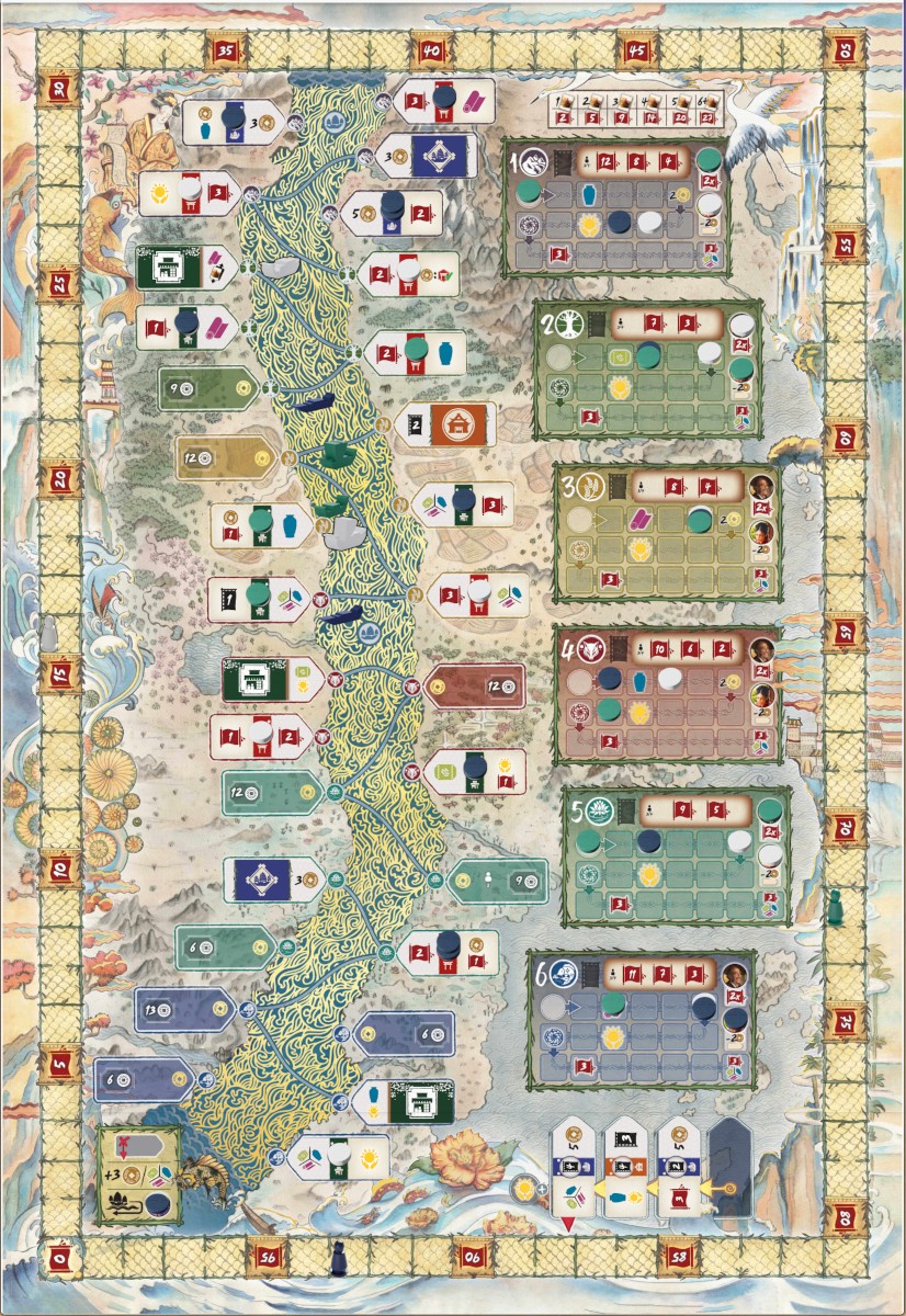 Thematisch wiederum ist „Am Goldenen Fluss“ bei mir an der Grenze zwischen „ich sehe das Thema auf dem Spielplan“ und „ich spiele es völlig abstrakt“. Ja, ich sammle reale Ressourcen wie Seide, Porzellan und Reis und beliefere Kunden damit. Und ich baue Gebäude an einem Fluss, den ich mit meinen Schiffen befahre. Aber im Kern schaue ich nur auf die Symbole auf den Gebäuden und den Karten, um den optimalen Zug zu finden, der meiner Strategie am besten passt. Das fand ich schade und ist vermutlich auch mein größter Kritikpunkt. Von den oben genannten Spielen fühlt sich „Tribes of the Wind“ wesentlich thematischer an, und selbst das eher abstrakte „Australis“ hat eine bessere thematische Umsetzung. „Am Goldenen Fluss“ könnte ich auch in viele andere Settings transferieren, ohne groß etwas anpassen zu müssen (beispielsweise in den Weltraum mit Gebäudebau auf verschiedenen Planeten).