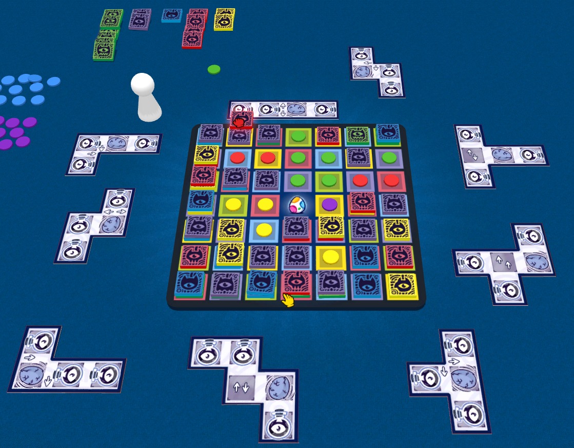 Von den Spielmechanismen ist „Khlor“ solide umgesetzt. Die Auswahl der Plättchen im Kreis erinnert beispielsweise an „Patchwork“, das Pattern-Matching der Monsterfarben an zahlreiche andere Polyomino-Spiele und Set-Collection ist auch eher bekannt. Recht neu für mich war, dass die Polyominos für das Entfernen und das gleichzeitige Setzen benutzt werden, was mir gefallen hat. Bei Tabletopia in der Draufsicht kam der Aspekt für mich gar nicht so zum Vorschein, aber in der Realität ist dies sicher besser. Wenn ich sehe, wo nur noch ein Monster liegt und auch die Feldfarbe darunter erkennen kann, ergeben sich zahlreiche taktische Überlegungen, wohin ich ein Plättchen legen will. Das kann aber natürlich auch zu Analyse-Paralyse führen, wenn jemand den optimalen Zug sucht. Ebenfalls interessant fand ich, dass ich durch das Legen der Eier selbst die Wertigkeit einer Monsterfarbe bestimme. Wenn zwei Spielerinnen beispielsweise in einer Farbe neun und acht Monster gesammelt haben, aber ein einziges Ei dieser Farbe auf dem Spielfeld liegt, bringt dies rein gar nichts. Umgekehrt gilt aber auch: Selbst ohne Ei kann ich viele Punkte sammeln, wenn ich beispielsweise alle Monster einer Farbe sammle, weil ich dann allein durch die Differenz zum zweiten (ohne Monster) sehr viele Punkte erhalte.