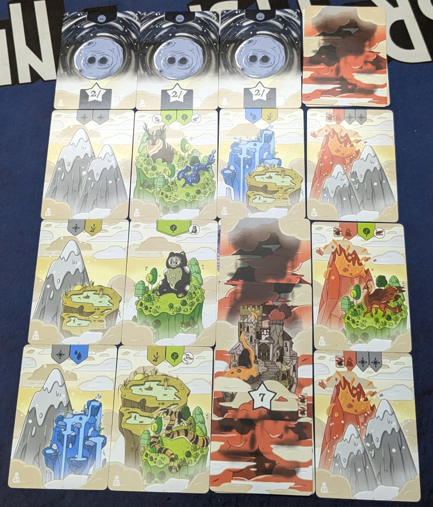 Bei „Strange World Above the Clouds“ handelt es sich um ein Kartenlegespiel, bei dem jeder vor sich ein 4x4-Raster an Karten auslegt. Wir spielen alle gleichzeitig, ziehen drei Karten vom Stapel, behalten eine davon und geben den Rest nach links weiter. Ich erhalte damit logischerweise auch zwei Karten von meiner Nachbarin. Aus diesen drei Karten wähle ich zwei Karten zum Behalten aus und gebe nur noch eine weiter. Am Ende hat jeder drei Karten auf der Hand. Nacheinander muss jeder alle drei Karten in das eigene Raster einbauen. Anfangs liegt doch bereits eine individuelle Startkarte. Ich muss immer orthogonal angrenzend bauen und darf die Grenzen des 4x4-Rasters nicht überbauen.