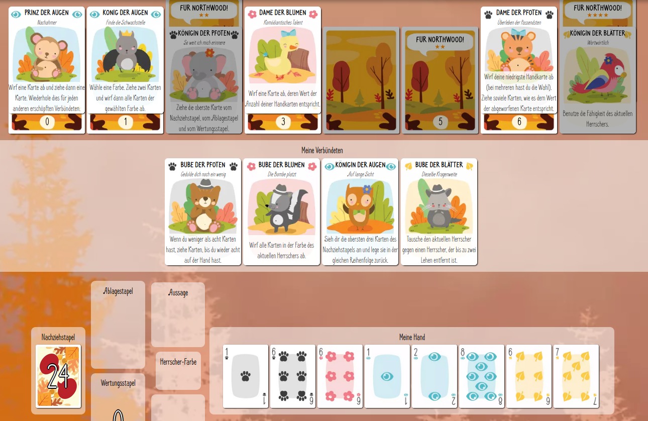 Beim BGA Summer of Games gab es mit „For Northwood“ auch ein kleines Solo-Stichspiel. Jede Runde ziehe ich acht Handkarten auf die Hand. Diese haben vier Farben mit Werten von 1 bis 8. Danach wähle ich eine der ausliegenden acht Karten, gegen die ich spielen will. Jede Karte hat eine Farbe, die den Trumpf vorgibt, und einen Effekt, den ich später nutzen kann. Den acht Karten sind von links nach rechts die Werte 0 bis 7 zugeordnet, was die Anzahl der Stiche ist, die ich exakt machen muss, um gegen die Karte zu gewinnen und Punkte zu erhalten. So kann ich selbst bestimmen, ob ich ein eher starkes oder schwaches Blatt auf der Hand habe und wie viele Stiche ich mir zutraue. Zusätzlich habe ich auch noch vier zufällige Karten mit Effekten vor mir liegen, die ich jede Runde einmalig einsetzen kann.