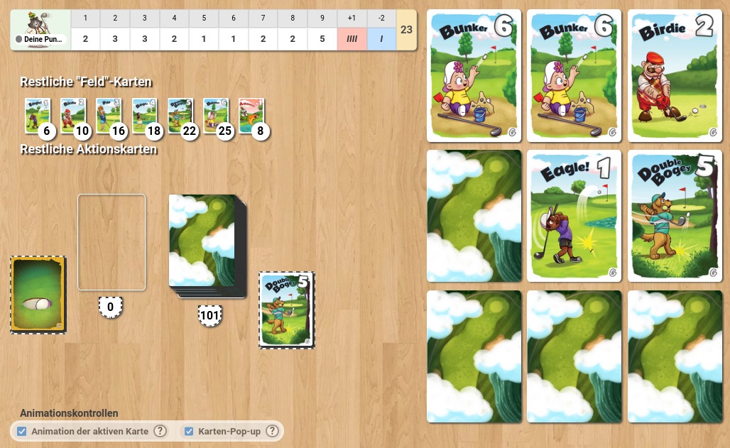 Ebenfalls beim BGA Summer of Games habe ich „Golfie“ gespielt. Allein oder theoretisch mit bis zu acht Spielerinnen (praktisch bis unendlich) trete ich bei dieser „Golf-Simulation“ an. Vor mir liegt ein 3x3-Raster aus verdeckten Karten. In einem Zug wird eine Aktionskarte aufgedeckt, die im Regelfall neun entsprechende Felder enthält mit 1 oder 2 Golfbällen darauf. An der Position der Golfbälle muss ich Aktionen durchführen. Entweder ich decke eine verdeckte Karte auf oder ich tausche ihre Position mit einer benachbarten Karte. Manchmal erscheint auf einer Karte auch mein Spielersymbol. Dann darf ich allein auch andere Positionen für die Aktionen wählen. Die Karten selbst zeigen Werte von 1 bis 6. Manche Aktionskarten zeigen auch ein Loch. Dann muss ich eine der drei Karten der obersten Reihe werten, wobei ich möglichst wenig Punkte haben will. Die gewertete Karte wird dann beiseitegelegt und die Karten darunter rutschen nach oben und es wird aufgefüllt. Wenn ich durch Aufdecken oder Tauschen drei gleiche Werte in eine Reihe oder Spalte bringe, werden diese abgelegt, ich erhalte -2 Punkte und es wird nach oben geschoben und wieder aufgefüllt. Eine Partie endet nach 9 oder 18 Runden.