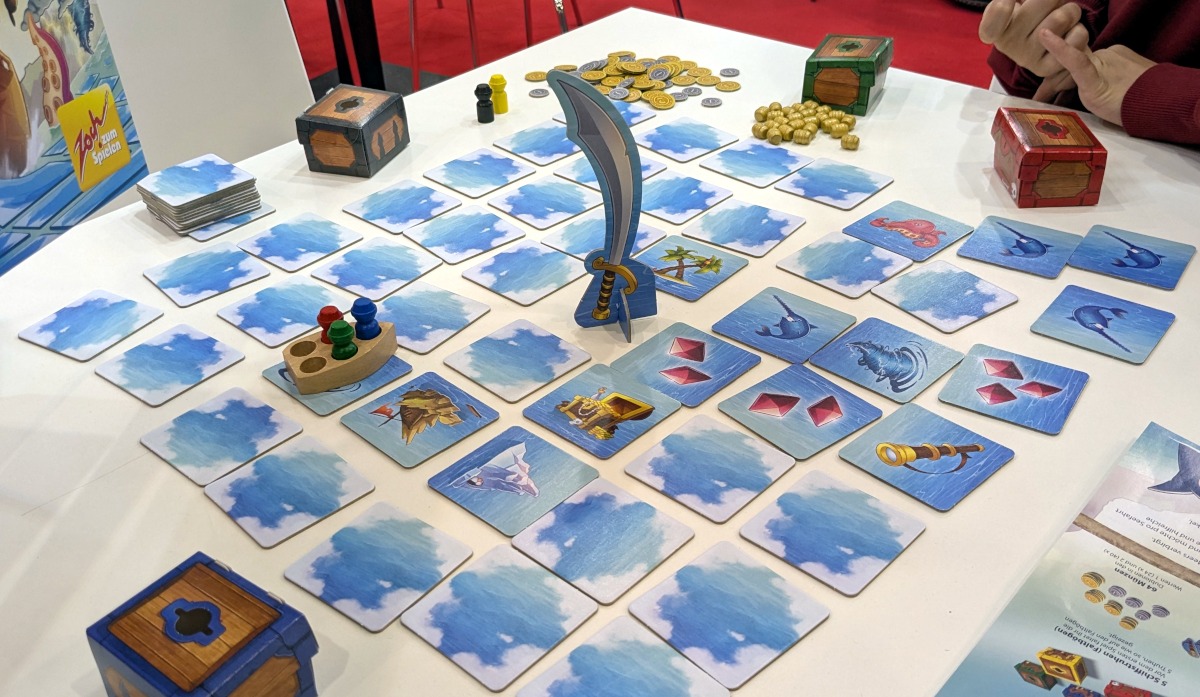Das erste Kinderspiel, das ich ausprobieren wollte, war „Käpt'n Memo“. Eine Mutter saß mit ihrem Sohn an einem Tisch und sie studierten die Anleitung. Da ich es auch testen wollte, setzte ich mich dazu und besorgte noch einen Erklärer am Zoch-Stand. Im Nachhinein war das nicht so optimal, da der Erklärer das Spiel leider nicht sehr gut und unstrukturiert erklärte.