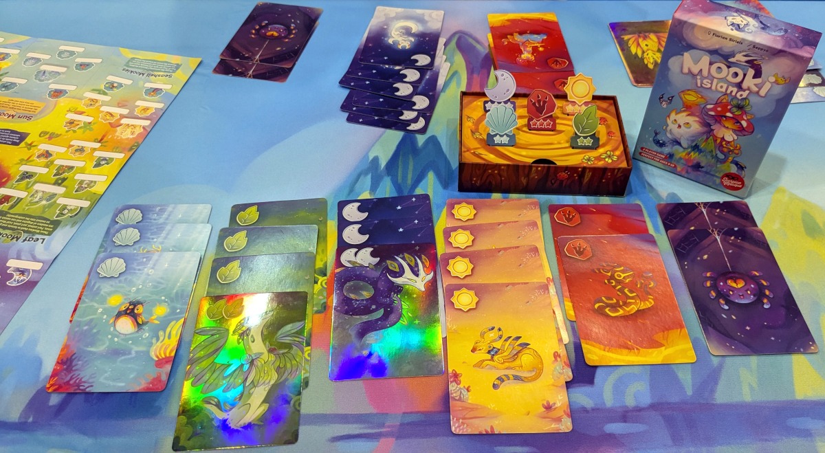 Das letzte Spiel am Donnerstag und damit auch das letzte Kinderspiel war „Mooki Island“, welches ein sehr einfaches Zweipersonenspiel ist. In der Mitte liegen zwei Stapel mit doppelseitigen Mooki-Karten, die es in fünf verschiedenen Farben (Sonne, Mond, Fossil, Muschel und Blatt) gibt. In meinen Zug wähle ich eine der beiden Karten, schaue mir beide Seiten an und lege dann im Normalfall die gewünschte Seite nach oben auf meinen Stapel. Bei einer Spinne lege ich diese auf den gegnerischen Stapel. Das wird gespielt, bis beide Kartenstapel in der Tischmitte alle sind. Danach zählt jede pro Farbe die Anzahl an Karten (wobei es noch besondere Karten gibt, die doppelt zählen). Wer die Mehrheit hat, erhält eine kleine Trophäe, die Punkte wert ist (Sonne und Mond je 4 Sterne, Fossil 3 Sterne, Muschel und Blatt je 2 Sterne). Bei Gleichstand wird keine Trophäe vergeben. Wer die meisten Spinnen hat, muss eine Trophäe seiner Wahl ablegen.