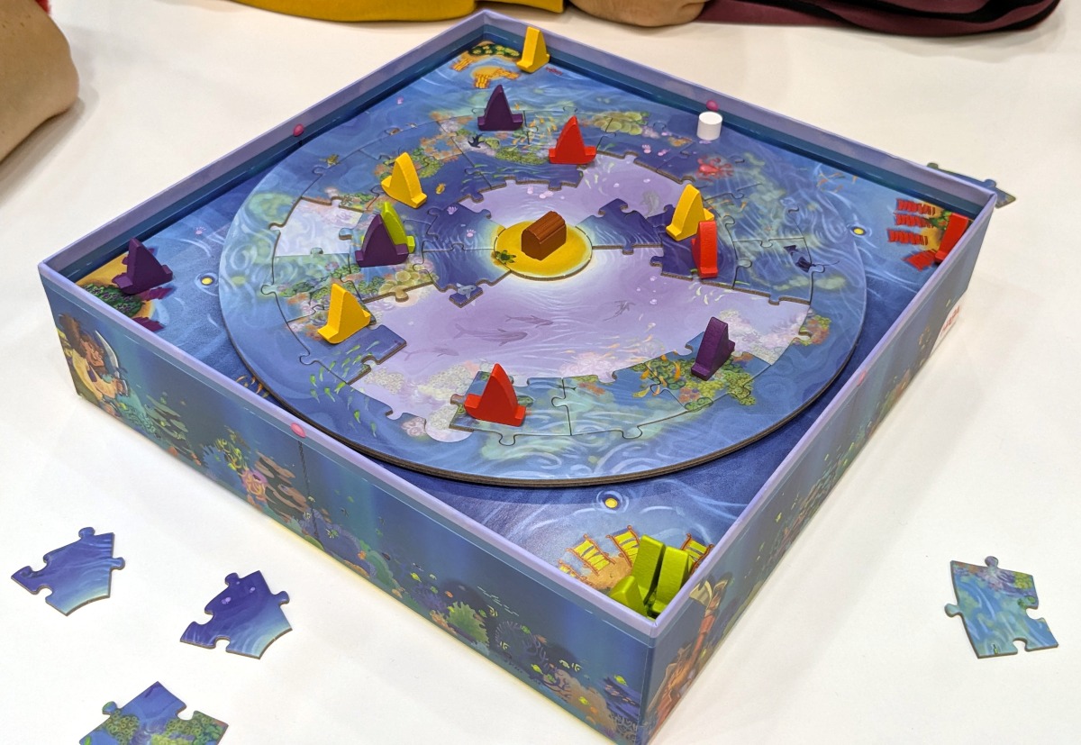 Danach ging es zu HABA, welche immer wieder interessante Kinderspiele veröffentlichen. Seit 2024 gibt es eine Reihe „Game Meets Puzzle“, bei der Puzzle- und Brettspiel-Aspekte vereint werden. Letztes Jahr schaute ich mir „Schatzsuche im Ozean“ an, was ganz okay war. Dieses Jahr wollte ich „Ocean Twist“ (schon wieder Ozean) kennenlernen.