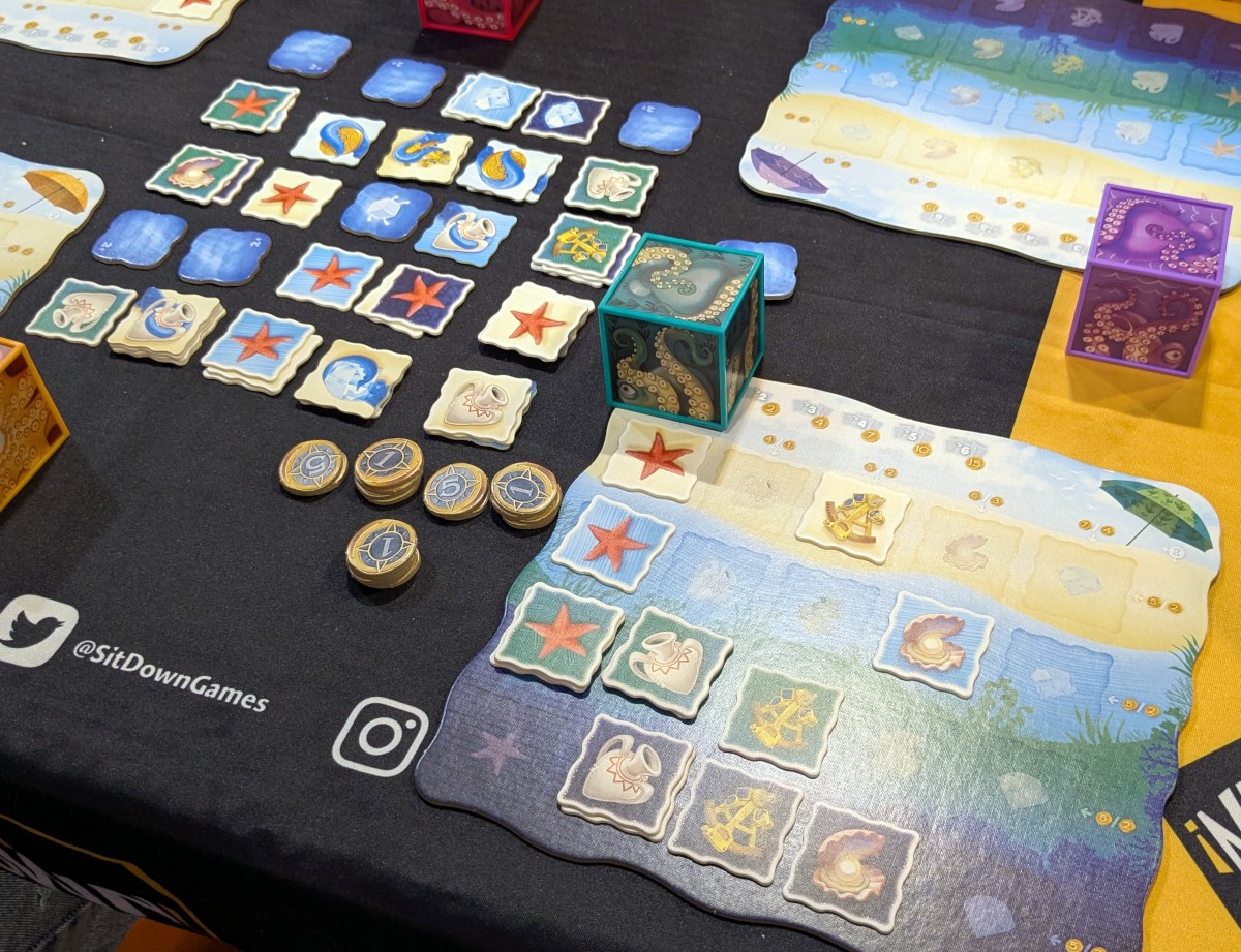 Ein weiteres Mal verschlug es mich ans bzw. ins Meer, denn auch „Octocube“ hatte einen Mechanismus, der mich interessiert hat. In der Tischmitte liegt ein 5x5-Raster (zu zweit nur 4x4) aus Plättchenstapeln mit fünf unterschiedlichen Meeressymbolen in vier unterschiedlichen Farben, die ich einsammeln will. In meinem Zug setze bzw. drehe ich meinen sechsseitigen Oktopus-Würfel auf dem Spielfeld. Zum Bewegen kippe ich diese einfach auf ein benachbartes Plättchen, welches dann magnetisch daran haften bleibt – wenn an meinem Octocube an der Seite noch kein Plättchen klebt. Maximal sechsmal kann ich meinen Würfel also kippen, bis alle Seiten belegt sind. Manchmal stehen mir aber auch Mitspielerinnen im Weg, sodass ich ggf. mehr Züge brauche. Wann immer ich will, kann ich den Octocube zu mir nehmen und alle Plättchen entfernen, die ich entfernen will, um diese zu werten. Warum ich nicht alle Plättchen abnehme? Weil ein einzelnes gesammeltes Plättchen einer Art keine Punkte bringt. Ich versuche also in einem Durchgang, möglichst viele gleichartige Symbole zu sammeln.