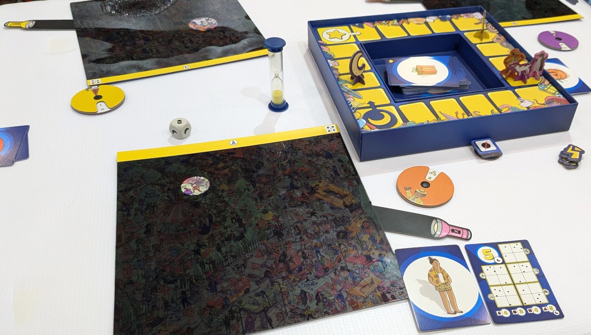 „Team Adlerauge“ ist eines der drei Spiele, die ich von der Messe mitgenommen habe (eines der anderen ist „Pictoo“, über welches ich im September bei Stand-Land-Spielt berichtet habe). Gefiel es mir auf der Messe schon sehr gut, macht es hier daheim mit den eigenen Kindern noch viel mehr Spaß. Wimmelbilder kommen bei den meisten Menschen sowieso gut an. Die Idee, diese per schwarzem Hintergrund zu verstecken und per weißem Kreis zu suchen, finde ich aber absolut genial. Es macht nicht nur spielmechanisch Spaß, sondern ergibt thematisch auch noch irgendwie Sinn. In der ersten Woche nach der Messe kam das Spiel jeden Tag (oft vor dem Kindergarten) auf den Tisch und wir spielten bereits eine zweistellige Anzahl an Partien. Das zeigt auch, dass das Spiel nicht eintönig wird. Hierfür sorgt, dass das gesamte Wimmelbild sehr groß ist und die fünf Pläne jeweils einen anderen Ausschnitt des Wimmelbildes zeigen. Gleichzeitig haben es die Designer Hjalmar Hach und Lorenzo Silva (die schon oft kollaborierten) bzw. Grafikerin Giulia Ghigini geschafft, dass auf jedem Ausschnitt die gleiche Anzahl an Figuren und Gegenständen zu sehen ist. Eine fantastische Leistung, wie ich finde.