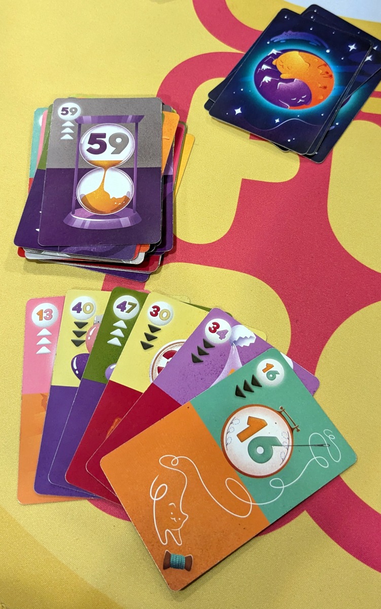 „Katzensprung“ ist … nett. Ja, zu mehr reicht es bei mir nicht. Es ist halt ein Card-Shedding-Spiel, bei dem ich zwei Möglichkeiten (erste und letzte Ziffer) habe, Gruppen zu bilden. Das ist für mich dann nicht Kniff genug, um es interessant zu machen. Hinzu kommen einige Sonderregeln, wenn eine Mitspielerin nicht folgen kann und passen muss, plus Sonderregeln, wenn alle gepasst haben, die das Spiel in meinen Augen sperriger machen, als es sein müsste.