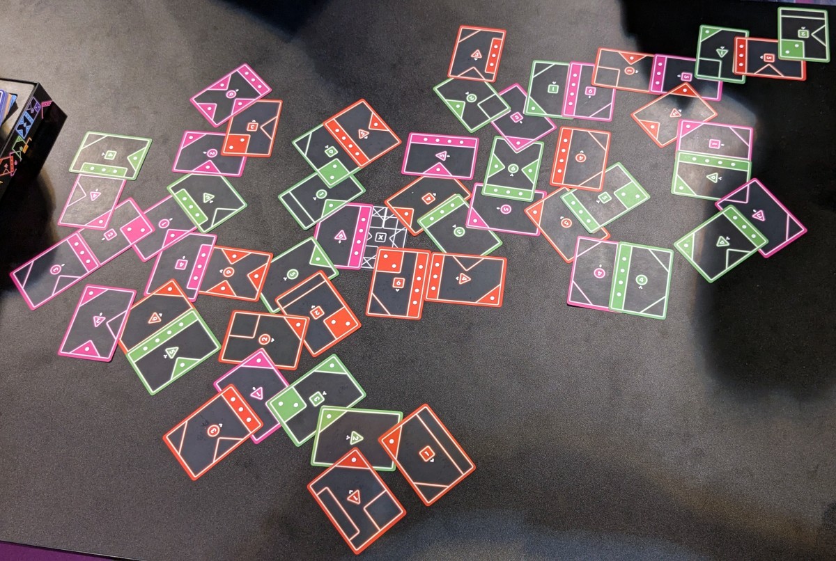 Den einzigen Nachteil – abgesehen von der Abstraktheit – ist der benötigte Tischplatz. Und es ist auch mit der Hauptgrund, wieso ich das Spiel nicht von der Messe mitgenommen habe. In Essen spielten wir zu dritt und der recht breite Tisch war danach gut belegt. Ich kenne die Größe meines „Spieltisches“ und eine Partie zu viert würde darauf vermutlich nicht mehr passen. Die 18 Karten pro Spielerin nehmen einfach sehr viel zweidimensionalen Raum ein. Es ist dabei eine tolle Designentscheidung, dass die Auslage fixiert ist – es wäre auch fast unmöglich, bereits zig ausgelegte Karten nachträglich zu verschieben – und der Tischrand die Spielfeldbegrenzung mimt. Aber es ist dann schlecht, wenn der Platz vom Flächeninhalt her nicht für alle Karten ausreicht. Es gibt zwar eine Variante, bei der man drei Runden mit jeweils sechs Karten spielt und somit weniger Auslagefläche benötigt. Ich weiß aber nicht, wie sich diese anfühlt.