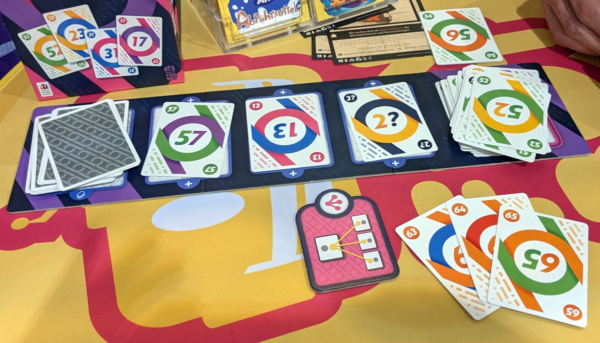 Am gleichen Stand von funbot gab es mit „Total verkettet“ ein sehr ähnliches Spiel zu „Katzensprung“. Erneut wollen wir unsere Karten loswerden und erneut befinden sich zweistellige Zahlen auf den Karten, die angeben, wie ich diese ablegen kann. Grundregel ist, dass ich mit einer Karte folgen muss, deren erste Ziffer der zweiten Ziffer der zuletzt ausgespielten Karte entspricht. Danach kann ich aber noch weitere Karten von der Hand ausspielen. Ein Bedingungsplättchen gibt vor, ob ich einfach nur weitere Karten mit der gleichen ersten Ziffer ausspielen kann (Pivot) oder ob ich mit meinen weiteren Karten ebenfalls eine Ziffernfolge aufbaue (Relay), analog zu den Grundregeln. Alternativ kann ich auch drei direkt aufeinanderfolgende Karten ablegen, ohne irgendwelche Bedingungen einhalten zu müssen.