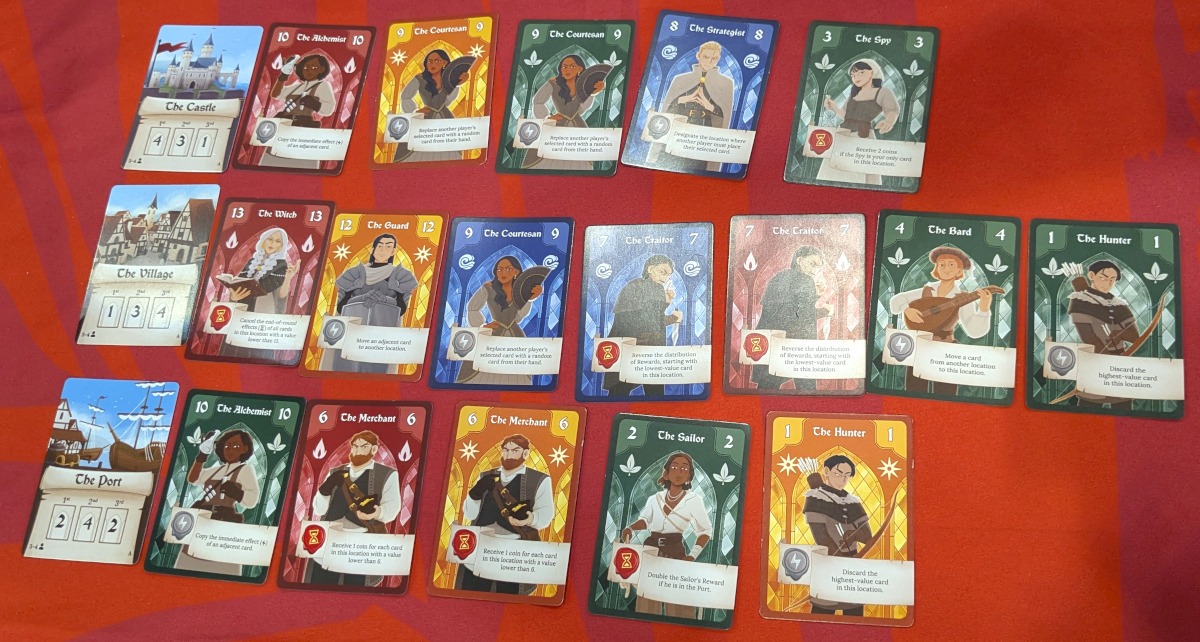 Weiter ging es mit „Emblems“, welches mich mechanisch interessierte. Jeder hat ein Deck mit identischen Personenkarten mit Werten von 1 bis 15. Jede Karte hat eine Eigenschaft, die sofort beim Ausspielen oder bei der Wertung am Rundenende wirkt. Am Rundenanfang zieht jede Spielerin sechs Karten von ihrem Stapel. Dann wählen wir alle geheim eine Karte aus und decken diese gleichzeitig auf. Beginnend bei der Startspielerin darf jeder seine Karte an einen der drei ausliegenden Orte legen. Die Karten werden beim Anlegen der Reihe nach geordnet, sodass der größte Wert immer ganz links neben dem Ort liegt. Soforteffekte werden – wie der Name sagt – sofort ausgeführt und verschieben Karten oder geben Gold. Nach dem Wechsel der Startspielerin wiederholen wir diese Auswahl und das Anlegen, sodass am Ende jeder drei (bei drei Spielerinnen vier) Karten an die drei Orte gespielt hat. Die Runde endet somit und jeder Ort wird gewertet. Dabei treten alle Rundenende-Effekte von ausliegenden Karten in Kraft. Nur die drei höchsten – im Normalfall am weitesten links liegenden – Karten kommen zur Wertung und erhalten je nach Ort eine Menge an Gold. Manchmal muss aber auch Gold gezahlt werden. Die drei gewerteten Karten werden abgeworfen. Dann zieht jeder drei Karten von seinem Stapel nach und es werden zwei weitere Runden auf die Art gespielt. Und die Spielerin mit dem meisten Gold gewinnt.