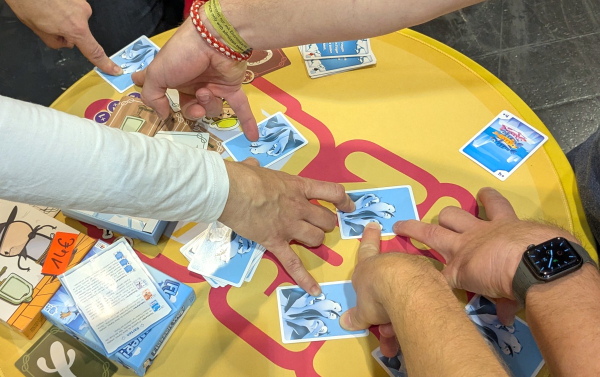 Erst am Folgetag war ich erneut bei funbot, aber es passt von der Berichterstattung her hier besser rein. Ein Freund wollte sich „Flossen weg!“ anschauen. Und so spielten wir zu dritt mit dem Erklärer eine Partie, wobei diese mittendrin um einen vierten Mitspieler ergänzt wurde.