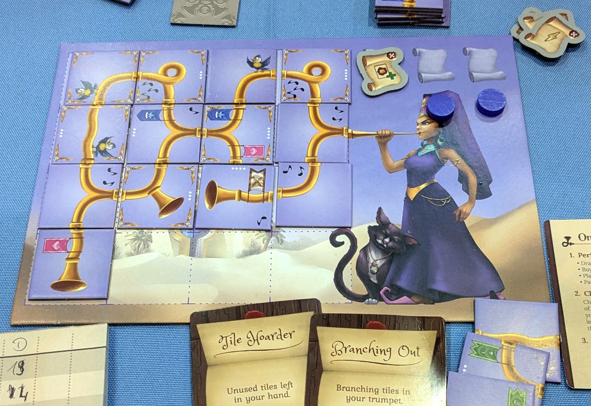 Und so spielt sich „Twisted Trumpets“ auch mechanisch nicht belanglos. Es ist oft nicht einfach zu entscheiden, welches Plättchen ich legen will. Dazu muss ich die etwas besseren Premium-Plättchen wiederum mit Plättchen bezahlen und das ist teuer, weil ich diese erst durch Aktionen nachziehen muss. Ebenso sind eine gute Planung und Aufmerksamkeit Pflicht. Zum einen hatte ich zwar einen sehr langen Weg zu meinem Trompetenausgang, sogar mit Knoten. Das bringt aber nichts, wenn es einen kürzeren Weg zum Anfang gibt, der nicht an den Knoten vorbeiführt. Zum anderen wollte ich mich beeilen und das Spiel schnell beenden. In der Eile habe ich aber einen offenen Trompetenausgang übersehen. Mein Mitspieler dagegen konnte seine letzten zwei Aktionen nutzen, um durch Vorteilsfelder weitere Aktionen zu erhalten und so den kompletten Plan vollzupuzzeln. Eine gewisse Vorausplanung gehört also dazu.