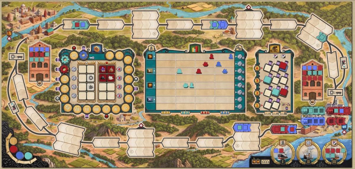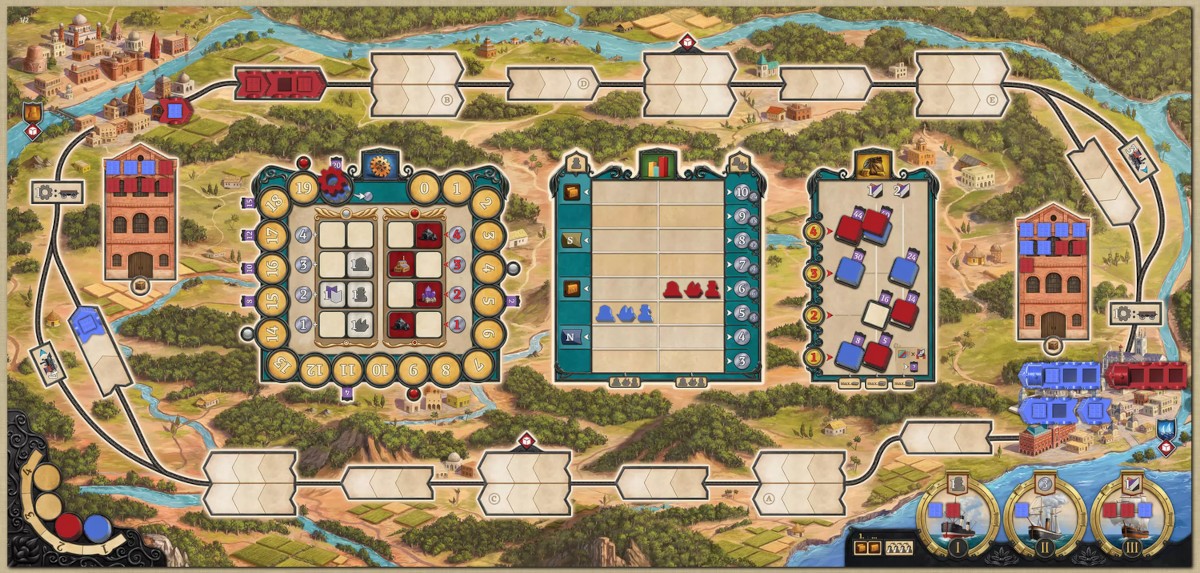 Von der Symbolik her ist „Movers & Shakers“ größtenteils gut verständlich. Einzig bei den Bedingungen für das zusätzlich Verladen und bei den Zugbewegungen musste ich erst erlernen, was diese bedeuten. Ich gebe aber zu, dass die Mouse-over-Onlinehilfe in BGA natürlich auch stark hilft. Am realen Tisch werde ich vermutlich anfangs die Anleitung zu Rate ziehen müssen. Aus irgendeinem Grund hat mich die Symbolik an „Nippon: Zaibatsu“ erinnert, was zufälligerweise vom gleichen Autorenduo Sentieiro/Soledade, aber einem anderen Verlag stammt. Sehr gefallen hat mir die Illustration von Andreas Resch, die ganz anders als „Nippon: Zaibatsu“ oder „Panamax“ daherkommt. Der Spielplan ist sehr detailliert gestaltet mit Wäldern, Wiesen, kleinen Flüssen und Häusern, die alle keinerlei Spielrelevanz haben. Aber es sieht halt schön aus und nicht so trist wie die anderen Spielpläne. Das Spielmaterial ist auch komplett sprachneutral, was eine Übersetzung natürlich stark vereinfacht. Einzig bei den Orten Benares und Kalkutta hatte ich mir anfangs gewünscht, dass deren Namen auch auf dem Spielplan stehen würden, um sie besser auseinanderhalten zu können.