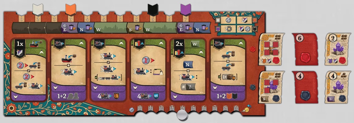 Immer, wenn ich von einem meiner zwei offenen Aufträge alle Warenwürfel (das sind immer drei oder vier) auf Züge verladen habe, erhalte ich den Bonus des Auftrags, ziehe zwei neue Aufträge der gleichen Kategorie (es gibt Aufträge mit kurzfristigen Boni und langfristigen Boni) und wählen eine davon aus. Kommt ein Zug in Benares oder Kalkutta an, werden die Waren für einen späteren Verkauf am Rundenende im Kontor gelagert. Je nach Größe des Schiffes bewegt der Besitzer seinen Performance-Marker (Zahnrad) ein bis drei Schritte auf der Performance-Leiste vorwärts. Das gibt manchmal einen kleinen Bonus und später Siegpunkte. Am Rundenende werden die Waren verkauft. Der Wert der Waren bestimmt sich anhand von zwei eigenen Markern (einer für Benares, einer für Kalkutta) auf der Marktleiste. Ein dritter Finanzmarker erlaubt mir beim Voranschreiten noch das Nehmen von Boni. Am Ende einer Runde, nach Verkauf der Waren und Erhalt des Geldes, rücken alle Markt-Marker auf den Platz des niedrigsten Markers zurück und ich erhalte einmalig Einkommen in Höhe meines Finanzmarkers. Zusätzlich werden auch die Warenwürfel aus den Kontoren abgelegt und ich ziehe je drei neue Verlade- und Bewegungsaktionskarten.