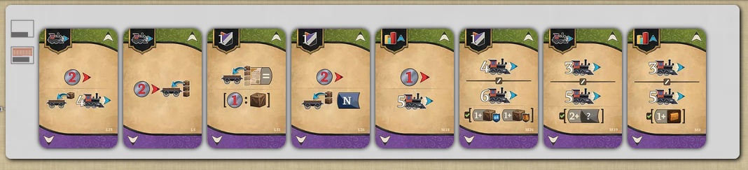 - Anstelle der vollen Auswahl aus einer zentralen Auslage für Verlade- oder Bewegungsaktionen hat jeder eigene Aktionskarten, die von einem gemeinsamen Stapel gezogen werden. Das erhöht den Zufall, verringert aber das komplette Durchrechnen.