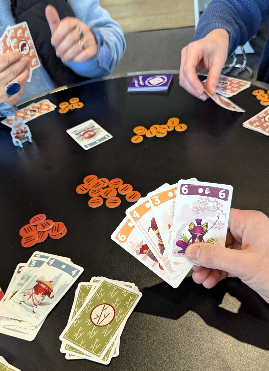 „Meister Makatsu“ ist ein Stichspiel ohne die üblichen Stichspielregeln. Man muss nicht folgen, jeder spielt zwei Karten und es gibt keinen Trumpf. Ich gebe zu, dass ich nach der ersten Erklärung des Spiels nicht kapiert habe, wie es funktioniert. Ich musste es einen Durchgang spielen, um die Zusammenhänge der „Stiche“ zu verstehen. Dann sitzt es aber.