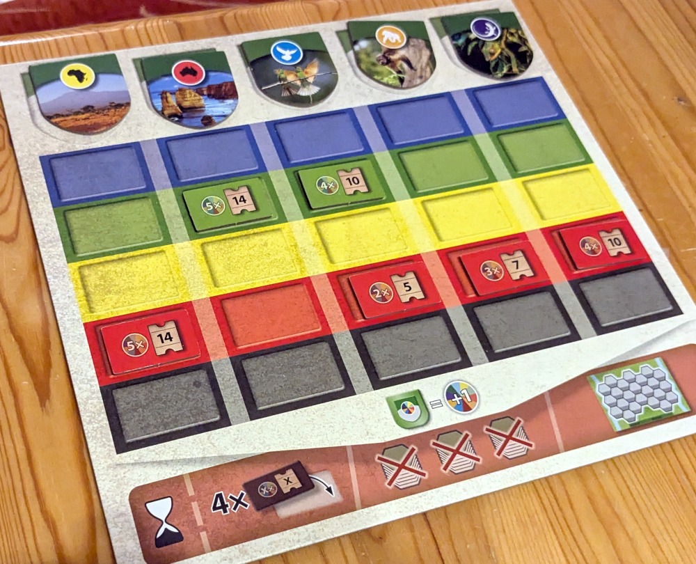 Am Spielende gibt es dann einen Punktesalat, den ich eigentlich nicht so gerne mag. Es ist nicht so schlimm wie „Mischwald“ von der Zählung her, aber dennoch bringt eigentlich jedes Hex-Plättchen Punkte. Manche in Abhängigkeit zu anderen Plättchen rundherum, sodass man schon etwas zählen muss. Am ehesten hat mich das an „Erde“ erinnert, bei dem es auch viele Wertungen in Abhängigkeit zu anderen Karten gibt. Schade ist, dass ich – wie bei „Erde“ – keinen guten Überblick habe, wer gerade vorne liegt. Während der Partie sehe ich eigentlich nur die Artenschutzprojekt-Punkte von den Mitspielerinnen richtig gut. Welche Punkte die Tableaus der anderen abwerfen, kann ich nicht sehen. Es ist für mich ja schon unmöglich, meine eigenen Punkte selbst einzuschätzen. Und das wäre eigentlich wichtig, wenn ich entscheiden muss, ob ich das Spiel beenden oder doch noch ein paar Punkte anders sammeln will.