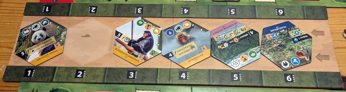 In „Artengarten“ bauen wir einen Zoo auf. Hierfür hat jeder einen Plan für ziemlich große Hex-Plättchen, welche Tiere, Gebäude und Projekte darstellen. Darunter liegen vier Aktionskarten von links nach rechts, mit denen ich meine Aktionen durchführe. Sechs Plättchen befinden sich in einer gemeinsamen Auslage, wovon ich am Anfang meines Zuges eins auf die Hand nehmen darf. Ich bin dabei aber auf die ersten X Plättchen beschränkt, abhängig von der Position meiner Projekte-Aktion. Danach muss ich eine Aktionskarte spielen. Drei Aktionen sind sehr ähnlich: Sie erlauben das Ausspielen eines Tieres einer bestimmten Art (Wasser, Wiese oder Felsen) oder das Nehmen von zwei verdeckten Hex-Plättchen vom Stapel. Ich muss bei der Aktionswahl immer darauf achten, dass die Aktionsstärke (Position der Aktionskarte in der Reihe) dem gespielten Tier entspricht oder sie übertrifft. Ich platziere dann das Tier-Hex-Plättchen auf meinem Tableau angrenzend an die bestehende Auslage. Manche Tiere haben dabei noch Anforderungen an Freiflächen (Rückseite der Hex-Plättchen), die an bestimmten Kanten des gelegten Plättchens angrenzen müssen. Da ist es einschränkend, dass ich die Plättchen nicht drehen darf. Manche Tiere geben mir einen Sofort-Bonus, meistens aber nur Siegpunkte für bestimmte Bedingungen. Die vierte Aktionskarte ist die Projekte-Aktion, welche mich ein Projekt einer gewissen Stärke spielen lässt. Diese haben sehr oft Anforderungen, wann und wo ich sie auf meinen Plan legen darf. Sie geben dauerhafte Effekte und erneut Siegpunkte am Partieende. Alternativ darf ich mit der Projekte-Aktion gezielt Hex-Plättchen aus der Auslage nehmen.