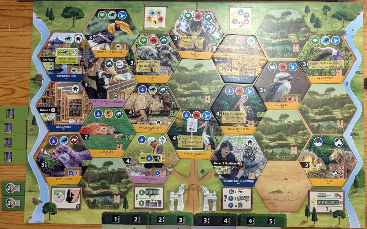 Was ich in der Erstpartie etwas schade fand, war die recht hohe Zufälligkeit der Hex-Plättchen. Als Artenschutzprojekte hatten wir unter anderem Afrika, Affen und Reptilien. Wir hatten aus der Vorpartie leider nicht so gut gemischt, aber in der ganzen Partie bekam ich nur einen Affen, kein Reptil und nur zwei Afrika-Symbole zu Gesicht. Und so konnte ich drei der fünf Artenschutzprojekt abschreiben und diese entsprechend nicht erfüllen. Gefallen hat mir, dass sich fehlende Symbole durch bestimmte Marker kompensieren lassen. Aber da man hiervon nicht Dutzende bekommt, muss man diese schon sehr gezielt einsetzen. Mein Mitspieler hatte da etwas mehr Ziehglück und konnte alle Artenschutzprojekte erfüllen und auch noch seinen Zoo vollpuzzeln. Immerhin das letzte gelang mir fast. Ich hatte am Spielende leider kein passendes Gebäude, welches ich noch hätte platzieren könnte. Ansonsten wäre die Partie anders ausgegangen (ich verlor mit 139:140 mit einem Punkt Abstand).