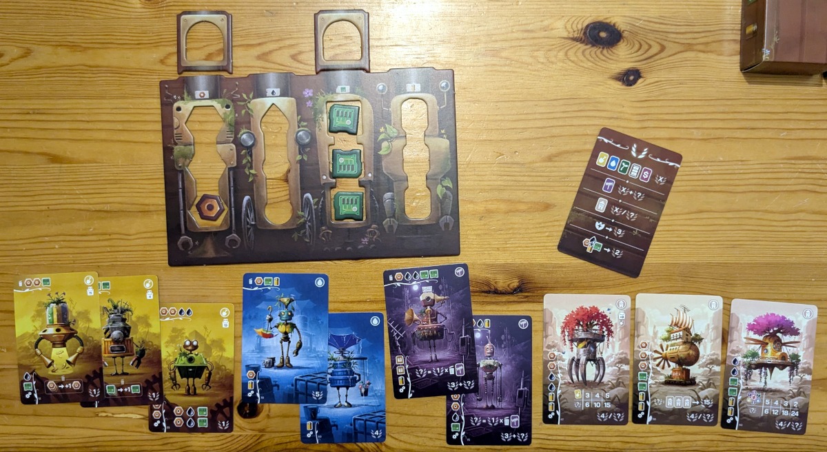 Gespielt wird über drei Jahreszeiten oder bis eine Spielerin keinen Zugriff auf baubare Hausroboter mehr hat. Von Jahreszeit zu Jahreszeit werden die Karten auch immer besser. Das heißt, sie sind teurer, haben aber auch bessere Effekte und bringen mehr Ressourcen beim Ausschlachten. Am Ende einer Jahreszeit erhält jeder einen Erweiterungsplatz für eine seiner Ressourcen. Die Spielerin mit den meisten Blättern auf grünen Ernterobotern erhält noch eine Batterie extra. Nach der dritten Jahreszeit endet die Partie und es gibt Punkte für die Roboter, für die Spielerin mit den meisten übrigen Ressourcen, für die Person mit den meisten Blättern von Ernterobotern, für die Kommunikationsroboter und für die gebauten Hausroboter.