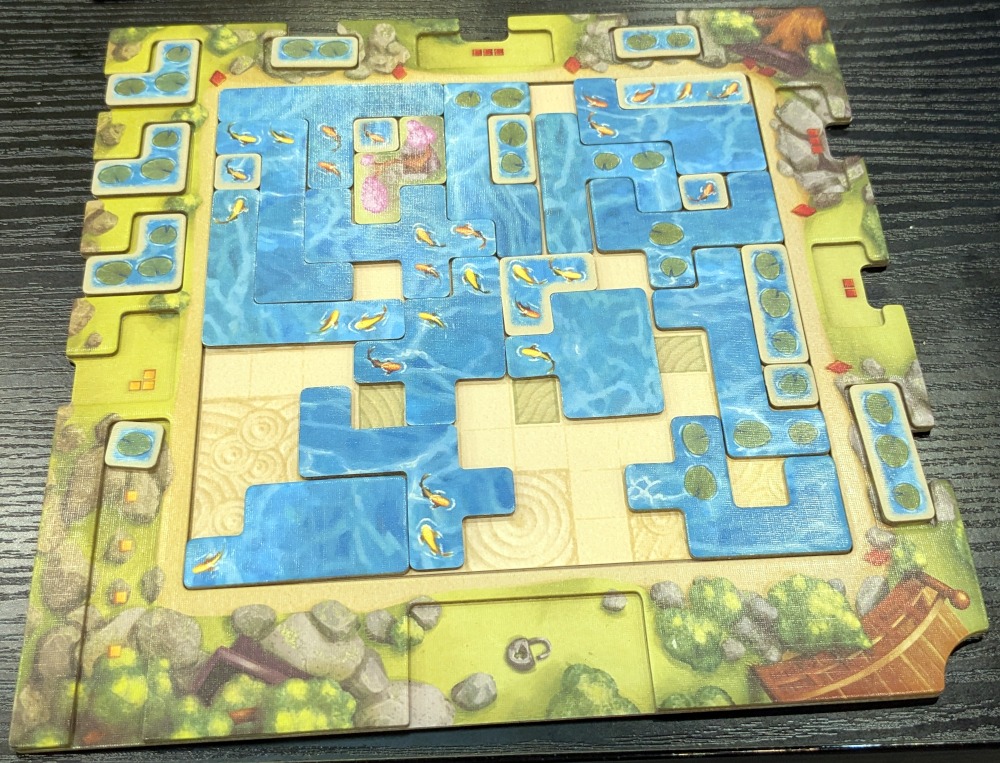 In „Garden Lake“ will jeder für sich den schönsten See mit Seerosen und Koi-Karpfen aufbauen. Hierfür hat jeder ein Tableau mit 12x12 Feldern vor sich liegen, was es mit teils sehr unförmigen Polyominos zu belegen gilt. Diese zeigen den Teich mit Wasser und mitunter Seerosen und Koi-Karpfen darauf. Um mein Tableau liegen in umgedrehter U-Form 16 zufällige solcher Plättchen, wie auch bei den anderen Mitspielerinnen. In meinem Zug habe ich immer vier Plättchen zur Auswahl: die zwei an meinen beiden Enden des umgedrehten U sowie jeweils eins an dem mir zugewandten Ende der Auslage der Mitspielerinnen. Das Plättchen lege ich beliebig auf meinen Plan. Dieser zeigt zwei besondere Bereiche in den vier Ecken, sowie in der Mitte und den vier Seitenmitten. Wenn ich einen dieser Bereiche komplett überdecke, erhalte ich das zugehörige Bonusplättchen der gleichen Form und kann es sofort einbauen oder für später aufheben. Es gibt auch drei Bereiche aus je vier Spalten/Reihen an jeder Seite. Wenn ich die erste Spalte/Reihe eines Bereichs fülle, erhalte ich ebenfalls ein Bonusplättchen für jetzt oder später. In der erweiterten Version gibt es noch grüne Bereiche auf dem Tableau. Wenn ich diese vollständig umbaue, anstatt sie zu überbauen, erhalte ich ein Dekorationsplättchen, das extra Punkte wert ist. Die Partie endet, wenn alle Spielerinnen kein Plättchen mehr sinnvoll auf ihren Tableaus unterbringen können. Es gibt dann einen Punkt für jede volle Spalte und Zeile, sowie zwei Punkte für jede Gruppe aus mindestens sieben zusammenhängenden Koi-Karpfen oder (exklusiv!) Seerosen. Gruppen, die an Dekorationsplättchen grenzen, geben zwei Punkte extra pro Dekoration.