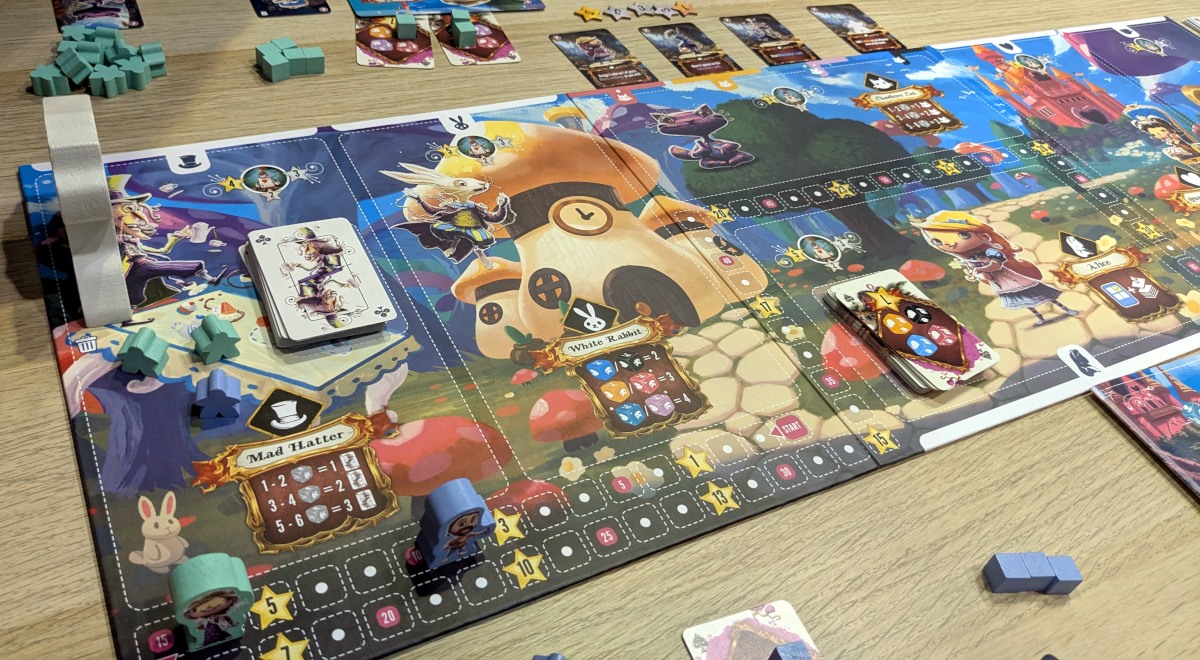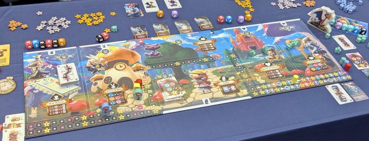 Auf „Rolling in Wonderland“ bin ich via Kickstarter aufmerksam geworden. Wie vielleicht bereits bekannt, interessieren mich alle Spiele, die „Alice im Wunderland“ als Setting haben. Dazu sprach mich das Spiel optisch mit den tollen Illustrationen von Arthur Mask auch sehr an. Leider funktioniert bei mir die Tabletop-Simulator-Umsetzung nicht – ich suche mit dem Online-Entwickler auch einen Monat nach der Messe noch nach dem Problem –, aber via Discord konnte ich für die SPIEL einen Platz für eine Testpartie reservieren. Das war aber eigentlich gar nicht notwendig, da am Verlagsstand am Donnerstag eh wenig los war. Leider so wenig, dass ich nur eine Proberunde – und ich meine mit Runde wirklich Runde, keine ganze Partie – spielen konnte. Dazu auch nur mit dem Erklärer ohne weitere Mitspielerinnen, was das Spielgefühl nur ansatzweise transportierte.