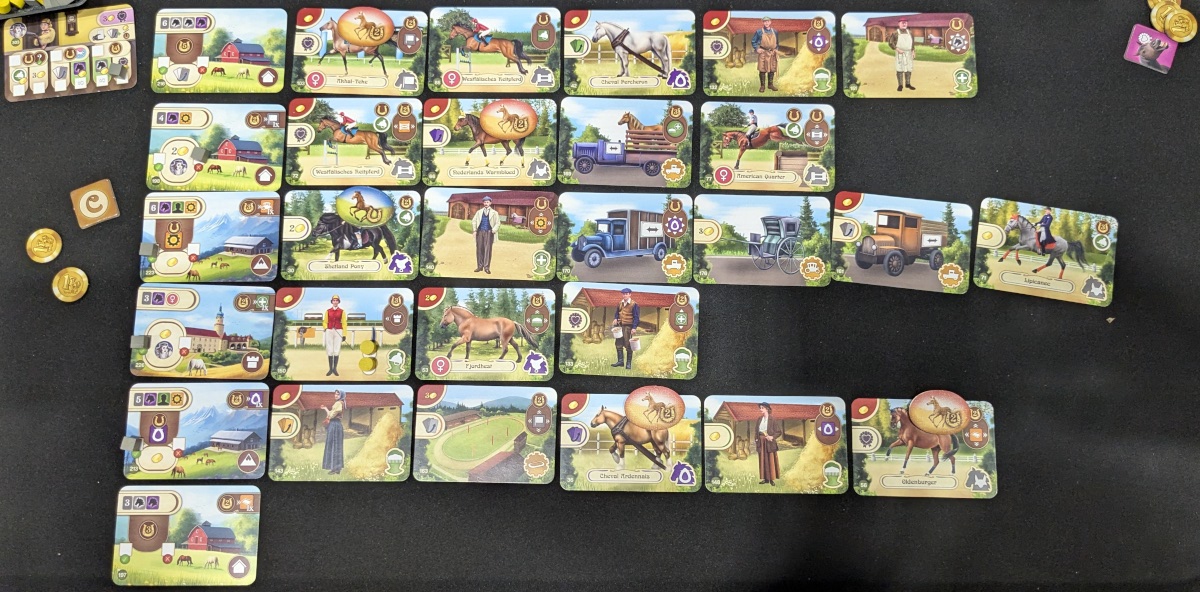 Zu den Karten, die ich ausspielen kann, zählen vor allem Pferde, die es als Rennpferde und Arbeitspferde gibt, jeweils mit drei unterschiedlichen Typen. Pferde kommen nicht immer, aber oft auch mit einem Geschlecht daher. Wenn ich einen Paarungsmarker habe und ausgebe, darf ich zu einer meiner Stuten einen passenden Hengst suchen und beide paaren, was mir einen kleinen Siegpunktmarker gibt. Sind beide Pferde von derselben Art, ist der Marker mehr wert. Der Besitzer des Hengstes erhält den Paarungsmarker für Siegpunkte – außer ich bin selbst der Besitzer. Dann muss ich den Paarungsmarker abgeben. Neben den Pferden gibt es noch zwei Stapel mit Angestellten in Form von Managern und Jockeys sowie Tierärzten und Stallburschen und dazu noch zwei Stapel mit Ausrüstung in Form von Fahrzeugen und Rennequipment.