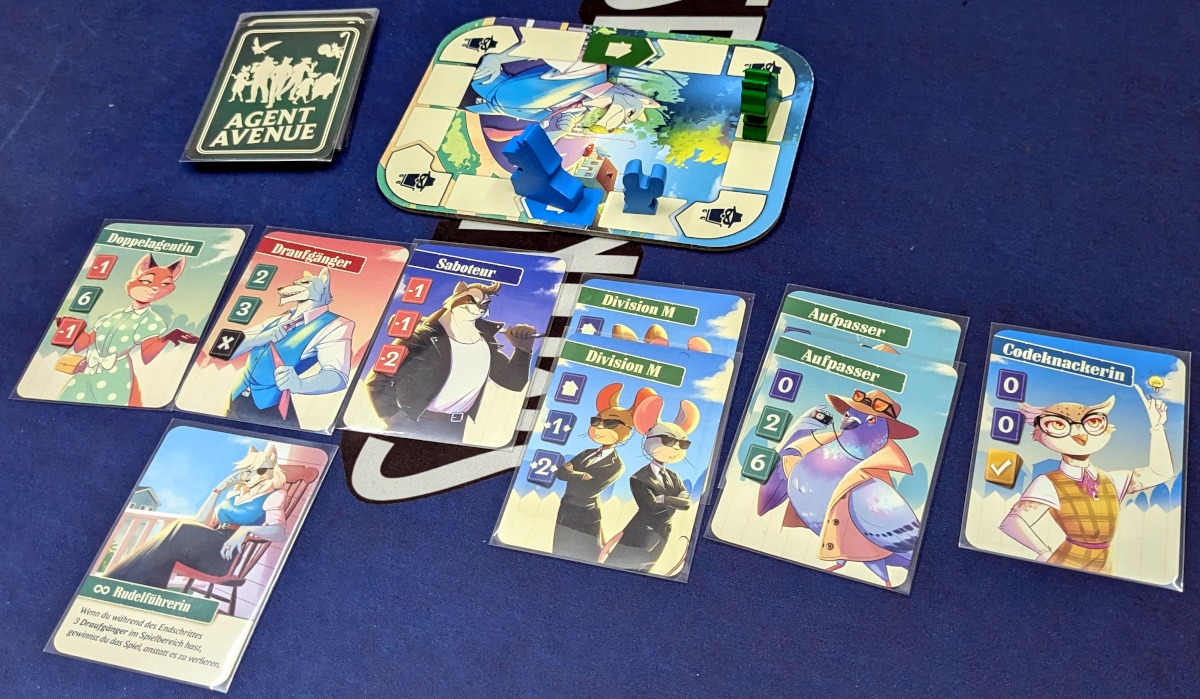 Apropos Katz und Maus: Wir spielten am Tisch auch gleich mit der Erweiterung „Agent Avenue: Division M“, was das Spiel nur minimal verändert. Die Erweiterung bringt einen neuen Agententyp (Mäuse) mit hinein. Beim ersten Ausspielen setze ich einen Mausmarker auf mein Startfeld. Mit der zweiten und dritten Karte darf ich die Maus um 1 oder 2 Felder bewegen. Landet die gegnerische Agentenfigur auf der Maus oder fängt die Maus diese, habe ich ebenfalls gewonnen. Die Erweiterung fügt sich recht nahtlos in das Spielgeschehen ein, was mir sehr gefällt. Es gibt kaum zusätzliche Regeln, dafür noch mehr Möglichkeiten, den anderen Agenten zu fangen.