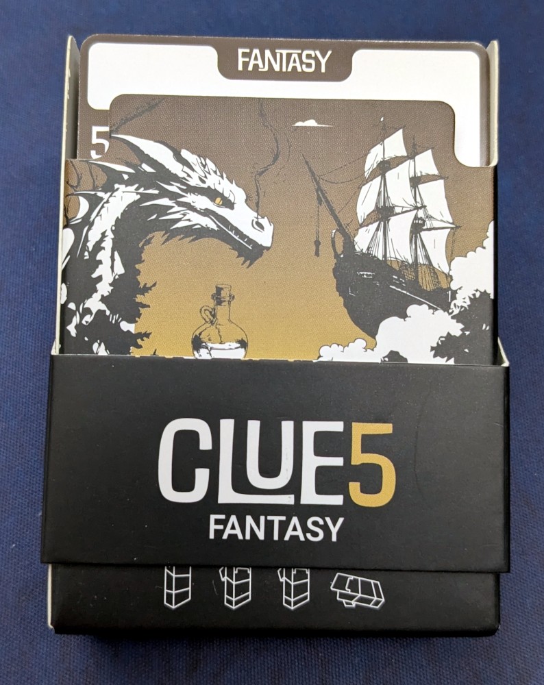 „Clue5“ ist so simpel, dass es bei BoardGameGeek nicht einmal zu einem Datenbankeintrag als Spiel gereicht hat. Und ja, es ist ein Wissensquiz ohne Ecken und Kanten. Bis zu fünf Hinweise werden vorgelesen, die die Lösung immer offensichtlicher machen. Wer sich gut in dem jeweiligen Bereich auskennt, hat natürlich Vorteile. Wir spielten die Fantasy-Edition, bei der oft Filme (Labyrinth, Edward mit den Scherenhänden) oder Filmcharaktere (Ron Weasley) gefragt waren. Blöd, wenn man sich in der Materie nicht wirklich auskennt. Wer von „Labyrinth“ noch nie gehört hat, wird auch mit zwanzig Hinweisen nicht auf die Lösung kommen.