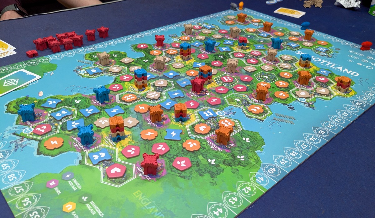 In irgendeiner Zukunft ist Schottland (oder Irland auf der Rückseite des Spielplans) zerstört und wir wollen es wieder aufbauen. Natürlich möchte jede Spielerin das auf ihre Art und Weise tun. Hierfür ziehen wir reihum aus einem Säckchen ein Plättchen, das ein Symbol zeigt: Pflanzen für Nahrung, Blitz für Energie oder Siedlungen, die 1 bis 4 Häuser zeigen. In meinem Zug lege ich dieses Plättchen auf ein passendes Hex-Feld. Manche davon sind auf dem Spielplan vorbedruckt. Andere Spielplanfelder sind leer, sodass jedes Plättchen (außer Häuser) dort platziert werden kann. Für Nahrung und Energie prüfe ich, wie groß das zusammenhängende Gebiet meiner gleichartigen Plättchen ist, und erhalte so viele Siegpunkte. Lege ich das Plättchen neben eine Kathedrale, markiere ich diese mit einem eigenen 3D-Kathedralenteil und erhalte eine geheime Zielkarte, die mir sagt, worauf ich spielen sollte, um Punkte am Partieende zu erhalten. Wenn ich das Plättchen angrenzend zu einer Burg lege, wird geprüft, ob ich die echte Mehrheit an Plättchen um diese Burg habe (bei Gleichstand sind Häuser weniger wert). In dem Fall ersetze ich die auf dem Feld stehende 3D-Burg einer Mitspielerin und setze meine eigene hin. Siedlungen gibt es in verschiedenen Größen, bestehend aus ein bis drei Hex-Feldern. Bei Größe 1 lege ich mein eines Siedlungsplättchen und erhalte so viele Siegpunkte, wie Häuser darauf abgebildet sind. Ansonsten wird eine Siedlung erst gewertet, wenn alle Felder der Siedlung belegt sind. Dann wird geprüft, wer die meisten Häuser (nicht Plättchen!) dort liegen hat, und es werden entsprechend einer Tabelle Punkte verteilt. Lege ich ein Siedlungsplättchen auf einen Hafen, erhalte ich einen extra Siegpunkt. Am Spielende gibt es dann fünf Siegpunkte je Burg, die Siegpunkte von den Zielkarten und Siegpunkte für unvollendete Siedlungen (gemäß Anzahl der Häuser).