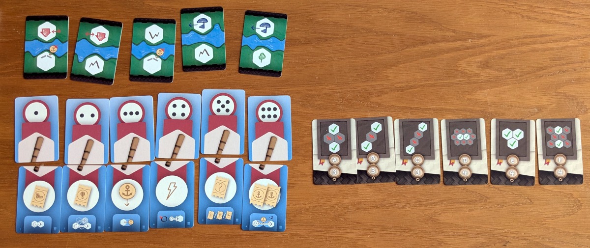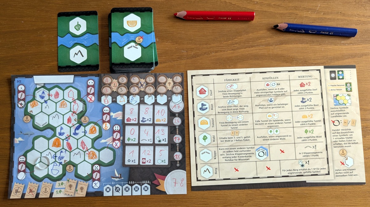 Nur kurz, worum es geht: Wir sind Architekten und gestalten alle unsere eigene Insel mit Siedlungen, Booten, Bergen, Tunneln, Wäldern und Klippen. Auf meinem Zettel sehe ich eine anfangs leere Insel mit Hexfeldern und eine durchsichtige Scheibe als Architekt. Die aktive Spielerin wählt eine von zwei ausliegenden Karten mit zwei Symbolen darauf. Ein Symbol wählt sie für sich zum Einzeichnen, alle anderen zeichnen das andere Symbol ein. Ich darf dabei nur angrenzend an meinen Architekten einzeichnen. Der Architekt darf sich bewegen, benötigt dafür aber eingezeichnete Wege (durch Siedlungen, die Straßen mitbringen, und Boote, die für einen Kanal sorgen), Bewegungstickets, wovon es nicht viele gibt, oder muss ein Symbol opfern. Durch besondere Bedingungen werden Symbole ausgefüllt, was Punkte bringt am Partieende. Über besondere Anordnungen der Symbole auf dem Feld kann ich ausliegende Missionskarten erfüllen und erhalte auch dafür Punkte. Dabei darf ich aber jedes Symbol nur für genau eine Mission benutzen. Und zum Schluss gibt es auf dem Plan noch sechs Wahrzeichenfelder. Erreiche ich eines mit meinem Architekten, schalte ich einen Bonus frei, der jede Partie variiert. Am Ende der Partie, nach 24 Karten, zählt man Punkte für Missionen, jedes Symbol, erreichte Wahrzeichen und leere Felder.