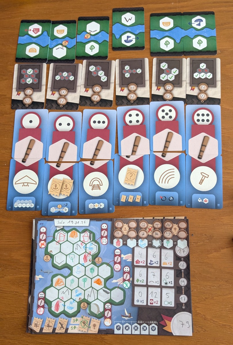 Wer sich an den Kritikpunkten nicht stört, findet mit „Peninsula“ aber ein tolles, komplexeres X'n'Write-Spiel – vor allem für ein oder zwei Spielerinnen. Vor allem solo macht mir die Knobelei sehr viel Spaß, weil ich dann ewig nachdenken kann – außer die Tochter will die Symbole einzeichnen und sitzt gelangweilt daneben, während ich die Karten auswähle. ;) Ich mag die Komplexität und die Variabilität durch die 26 Missionen und 20 Wahrzeichenboni. Dazu gibt es auf der Rückseite des Plans noch eine andere, etwas schwierigere Insel. (8,0)